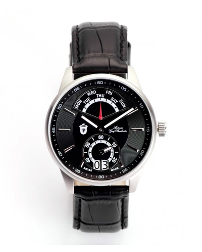 The watch is manufactured in Switzerland (100% Swiss made) from materials of best quality in a Limited Edition (500 pieces). The case has a 41 mm diameter from Stainless Steel and it comprise a Swiss Quartz system with an analoge black display. The bezel is stationary and sustains the mineral crystal dial window. The product has a resistance of 50 m under water.