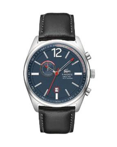 Special features | Black leather strap, Round stainless steel case, 44mm, Blue dial with silver-tone numerals, stick indices, two hands, red second hand, date window and croc logo, Quartz movement, Water resistant to 50 meters |
