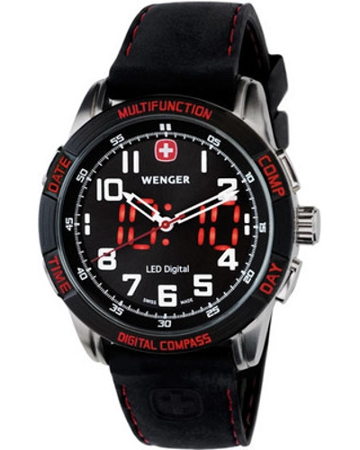 A multifunctional timepiece with an attractive analog dial and a stealthy LED digital readout. Approximate Case Diameter: 43 mm. Clasp: Buckle. The Nomad Compass 70430 features a black dial with red LED digital compass, date, day & time along with a black silicone strap. Dial window material type: Mineral. # 70430 #