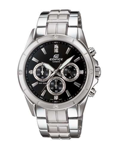 Casio Edifice Sheen Pair Design Series Stainless Steel Band (October 2009 Model) Casio Watch #EF-544D-1AV. Dial: Black. Glass: Mineral. Water resistant: 100 meters. Specification - 5119. Measuring capacity: 29' 59. Accuracy: ±20 seconds per month. battery life. Regular timekeeping. Size of case / total weight. 47.0 X 42.5 X 10.2 mm / 151 g. (Mens Watch). Band: Stainless steel. Movement: Quartz. Case: Stainless Steel Accuracy per month: ±20 sec Battery Type: SR621W Battery Life: 2 YRS. 1-second stopwatch. Measuring mode: Elapsed time. Approx. 2 years on SR621SW. Analog: 3 hands (Hour, minute, second), 3 dials (Stopwatch minute and second, 24-hour). EF-544D