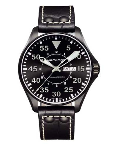 Hamilton Men's H64785835 Khaki King Pilot Black Dial Watch : Black PVD stainless steel case with a black leather strap with contrast stitching. Fixed bezel. Black dial with luminous hands and stick hour markers. Arabic numeral minute markers at 5 minute intervals. Minute markers around the outer rim. Luminescent hands and markers. Day and date display appears at the 3 o'clock position. Automatic movement. Scratch resistant sapphire crystal. Screw lock crown. Screw in skeleton case back. Case diameter: 46 mm. Tang clasp. Water resistant at 200 meters/ 660 feet. Functions: hours, minutes, seconds, date.