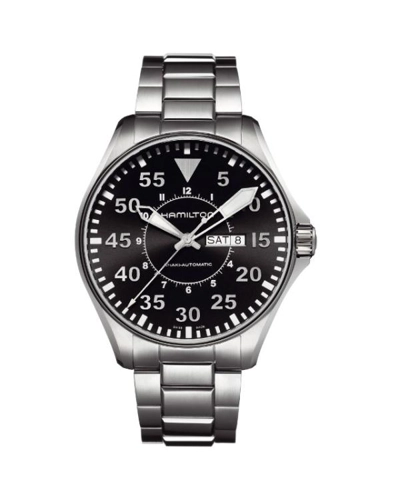 Classic-look mens Hamilton Khaki Pilot Automatic watch in high-shine stainless steel - set around a black dial with day and date functions