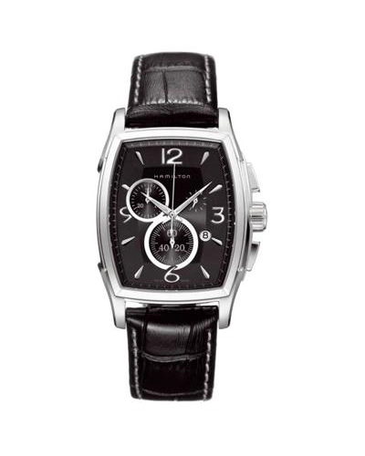 Hamilton Men's H36412735 Jazzmaster Black Dial Watch : Stainless steel case with a black leather strap. Fixed stainless steel bezel. Black dial with silver-tone hands and index hour markers. Arabic numerals mark the 3, 6, 9 and 12 o'clock positions. Minute markers around the outer rim. Luminescent hands. Date display appears at the 4 o'clock position. Chronograph - three sub-dials dials displaying: 60 seconds. 30 minutes and 1/10th of a second. Quartz movement. Scratch resistant sapphire crystal. Solid case back. Case dimensions: 42 mm x 37 mm. Case thickness: 12 mm. Tang clasp. Water resistant at 100 meters / 330 feet