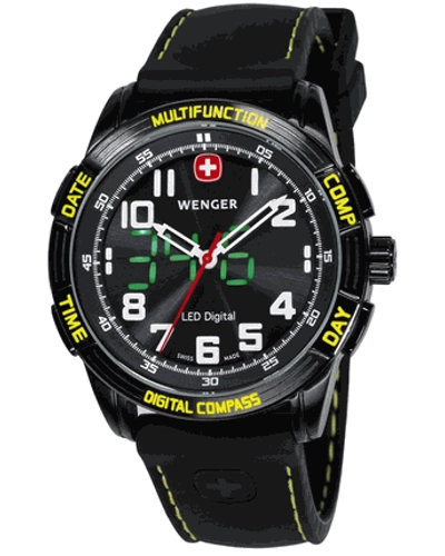The Wenger Nomad LED Compass Gents Watch 70434 is a highly functional timepiece for men which includes a number of useful features as well as a stylish analogue dial and a subtle LED digital readout.
