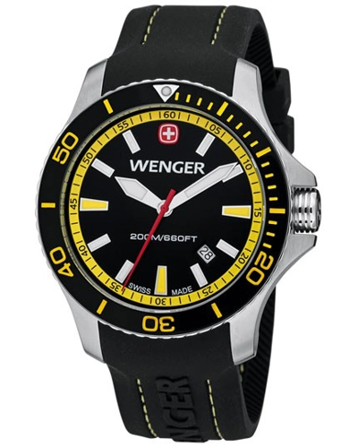 Eye-catching mens Wenger Sea Force watch in black, with yellow and silver highlights. Features include a stainless steel case, rubber strap, date function, luminescent hands and sapphire glass
