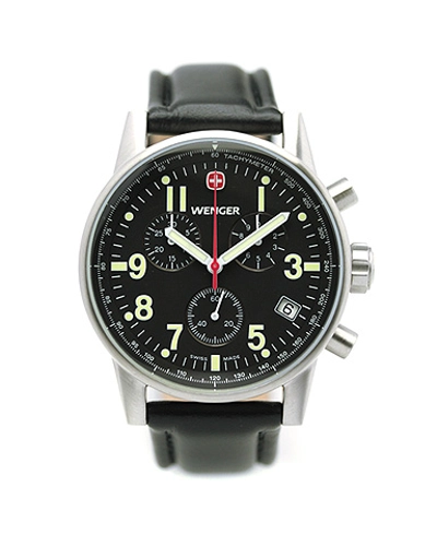 Wenger Watch Commando Chrono 70825.XL.XLGender: Men's Movement: Swiss quartz chronograph Water Resistance: 100m (330 ft.) Case Material: Stainless steel Case Finish: Brushed Case-back: Screw-on Internal Bezel: Tachymeter measures speed over a known distance 30-Minute chrono function Crystal: Sapphire Coated Crystal Luminocity: Hands, numerals and markers Additional Features: Large Crown Date display Euro 273 2 Year DPW limited warranty Strap / Bracelet: Genuine leather strap Buckle: Metal with Wenger logo Lug Width: 21mm Power Source: Battery Scroll upScroll down» Product Manuals