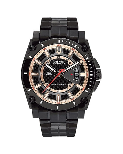 Sporty-look mens Bulova Precisionist Champlain model in black Ion-plated steel, featuring a carbon fibre and rose gold coloured dial with date and 24 hour track. The solid case is 300m water resistant with a curved crystal, and has a screw down crown