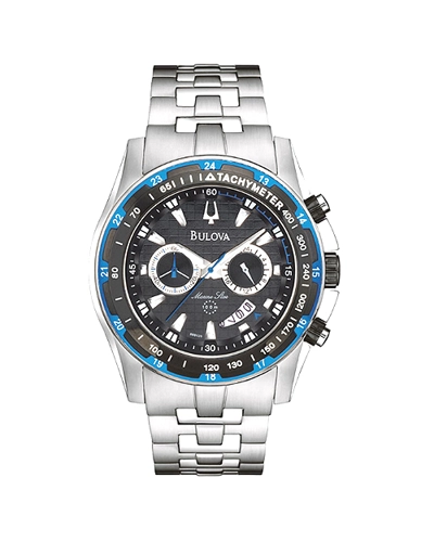 Mens Bulova Marine Star model with a sporty look in stainless steel. Features include a black dial, chronograph, date function and Japanese Miyota Quartz movement