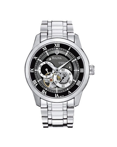 Get Bulova elegance. Featuring advanced chronograph functionality, set off by classic silver Roman numeral hour marks.
