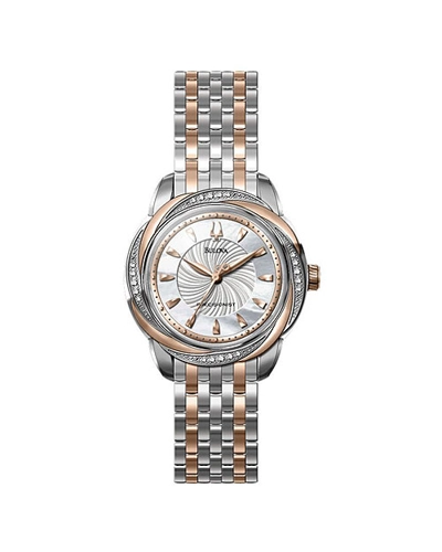 | Additional Features: | Domed Metalized Crystal, Luminous Rose Gold Tone Hands, 20 Diamonds Individually Hand Set On A Swirl Pattern Bezel |
