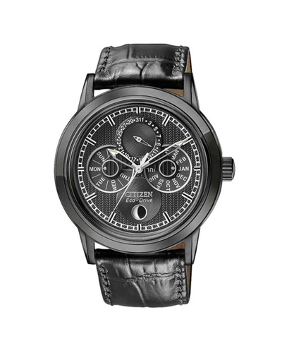 | Additional Features: | Moon Phase Indicator, White Indices Form Surrounding Ornamental Minute Track, WhiteTone Hands And Index Hour Markers, Three Subdials, Black Ion Plated Case |