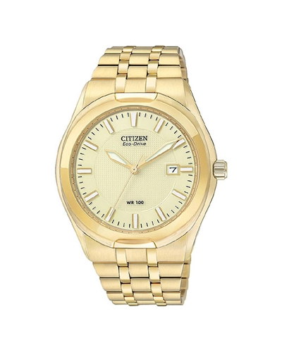 Eco-Drive solar-powered technology - Japanese quartz movement for secondary battery - Polished gold-tone sword hands with luminous accents and sweep seconds - Analog date aperture at three o'clock - Champagne dial with shimmery grid textured inner circle and polished black logo applique below twelve o'clock - Brushed gold-tone stainless steel bracelet with polished detailing - adjustable links and push-button-clasp - Polished gold-tone stainless steel bezel - Brushed/polished gold-tone stainless steel round case - Textured gold-tone steel crown - 100 meters/330 feet water resistant