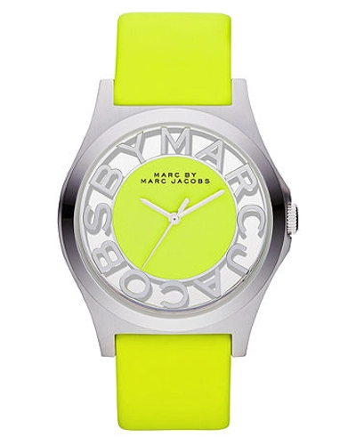 Go bold with this Marc by Marc Jacobs watch. With a bright yellow leather strap and clear cutout dial, this stainless steel timepiece is the ultimate spring style statement.