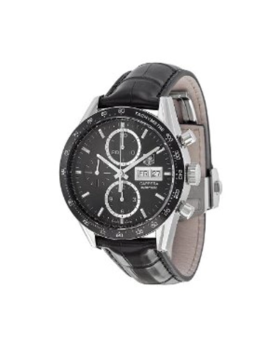 Stainless steel case with a black leather strap. Fixed blackaluminiumbezelwithtachymeter. Black dial with luminous hands and index hour markers. Minute markers around the outer rim. Dial Type:Analog. Luminescent hands and markers. Day of the week and date display at the 3 o'clock position. Chronograph - three sub-dials displaying: 60 second, 30 minute and 12 hour. Automatic movement. Scratch resistant sapphire crystal. Pull / push crown. Solid case back. Case diameter: 41 mm. Round case shape. Band width: 22.9 mm. Band length: 9 inches. Fold over deployment clasp. Water resistant at 100 meters / 330 feet.Functons: chronograph, date, day, hour, minute, second. Luxury watch style.TagHeuerCarrera Automatic Chronograph BlackDialBlackLeatherMens Watch CV201AGFC6266.