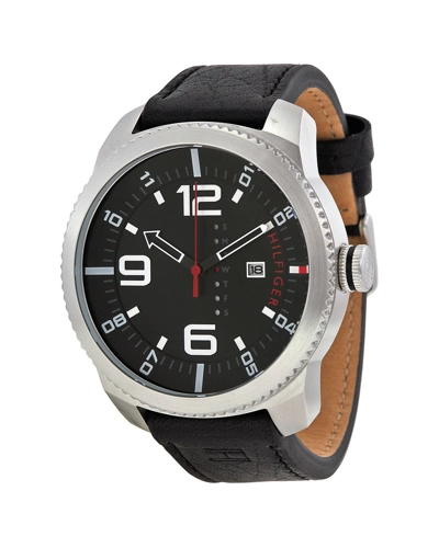 Special features | Black Leather Strap, Round Stainless Steel Case, 50mm, Black Dial with White Numerals, Stick Indices, Two Hands, Red Second Hand,, Date Window, Quartz Movement |