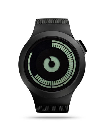 | Strap | PVD (Physical vapor deposition) matte black stainless steel mesh, tapered from 23 mm to 21 mm |