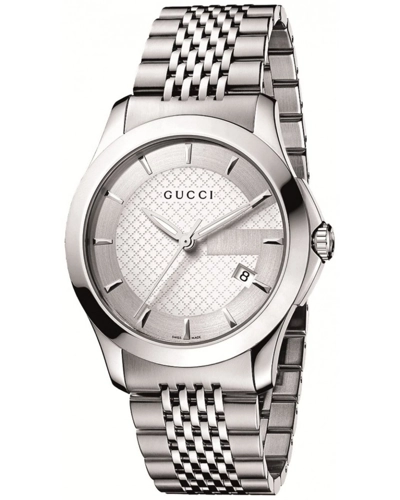 Stainless steel case with a stainless steel link bracelet. Fixed stainless steel bezel. Silver with silver Gucci 'G' dial with silver-tone hands and stick hour markers. Dial Type: Analog. Date display appears at the 4 o'clock position. Swiss quartz movement. Scratch resistant sapphire crystal. Textured steel crown. Stainless steel case back. Case diameter: 38 mm. Case thickness: 7 mm. Band width: 20 mm. Hidden deployment clasp. Water resistant at 30 meters / 100 feet. Functions: hours, minutes, seconds, calendar. Casual watch style. Gucci G Timeless Men's Stainless Steel Bracelet Watch YA126401.