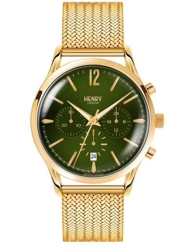 Shop Henry Londons Chiswick 41mm mesh bracelet wristwatch featuring a forest green chronograph dial. The watch case is gold and completed with a double domed acrylic lens. The watch strap is a gold Milanese mesh bracelet. This Chiswick model features the traditional hour, minute and second hands and in addition a calendar window at 6 oclock and three sub-dials for the chronograph, each of which performs the different functions of a traditional chronograph.