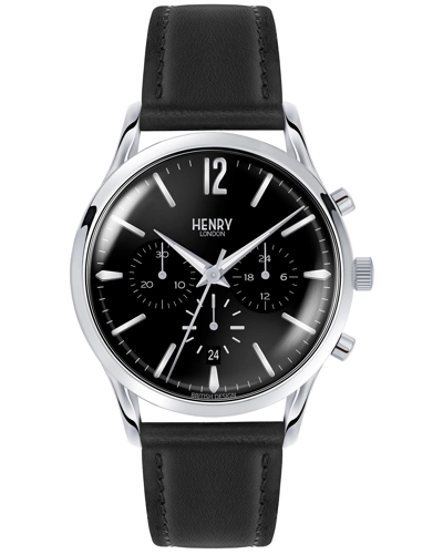 Buy Henry Londons Edgware 41mm leather strap wristwatch featuring a jet black chronograph dial. The watch case is stainless steel and completed with a double domed acrylic lens. The watch strap is made from soft black leather with cream lining. This Edgware model features the traditional hour, minute and second hands and in addition a calendar window at 6 oclock and three sub-dials for the chronograph, each of which performs the different functions of a traditional chronograph.