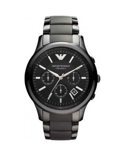 Mens Emporio Armani Ceramica watch in black, set around a sleek dial with date function and chronograph. The ceramic bracelet fastens with a push-button clasp