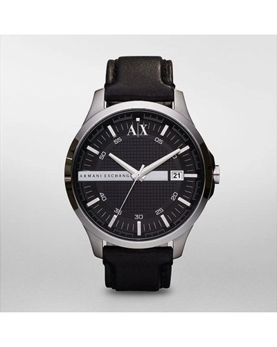 Stainless steel case with a black leather strap. Fixed stainless steel bezel. Black dial with silver-tone hands and index hour markers. Minute markers around the rim. The Armani AX Exchange logo appears at the 12 o'clock position. Dial Type: Analog. Luminescent hands and markers. Date display at the 3 o'clock position. Quartz movement. Scratch resistant mineral crystal. Solid case back. Case diameter: 46 mm. Case thickness: 10.9 mm. Round case shape. Tang clasp. Water resistant at 50 meters / 165 feet. Functions: date, hour, minute, second. Casual watch style. Armani AX Exchange Whitman Black Dial Black Leather Mens Watch AX2101.