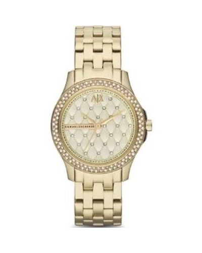 | Gold-plated stainless steel case and bracelet. Fixed gold-plated bezel set with crystals. Champagne quilted dial set with Swarovsk crystals with gold-tone hands. No markers. The Armani AX Exchange logo appears at the 12 o'clock position. Dial Type: Analog. Quartz movement. Scratch resistant mineral crystal. Pull / push crown. Solid case back. Case diameter: 36 mm. Case thickness: 9.4 mm. Round case shape. Band width: 18 mm. Deployment clasp with push button release. Water resistant at 50 meters / 165 feet. Functions: hour, minute, second. Dress watch style. Armani Exchange Champagne Dial Gold-plated Unisex Watch AX5216. | |||||||||||||||||||||||||||||||||||||||||||||||||