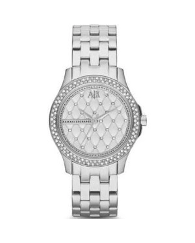| Stainless steel case with a stainless steel bracelet. Fixed silver-tone bezel set with crystals. Silver quilted dial set with Swarovsk crystals with silver-tone hands. No markers. The Armani AX Exchange logo appears at the 12 o'clock position. Dial Type: Analog. Quartz movement. Scratch resistant mineral crystal. Pull / push crown. Solid case back. Case diameter: 36 mm. Case thickness: 9.4 mm. Round case shape. Band width: 18 mm. Deployment clasp with push button release. Water resistant at 50 meters / 165 feet. Functions: hour, minute, second. Dress watch style. Armani Exchange Hamilton Silver Quilted Dial Stainless Steel Ladies Watch AX5215. | |||||||||||||||||||||||||||||||||||||||||||||||||
