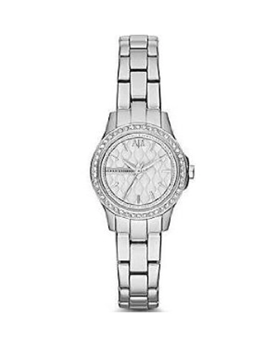 | Stainless steel case with a stainless steel bracelet. Fixed silver-tone bezel set with crystals. Silver dial with silver-tone hands and index hour markers. The Armani AX Exchange logo appears at the 12 o'clock position. Minute markers around the outer rim. Dial Type: Analog. Quartz movement. Scratch resistant mineral crystal. Pull / push crown. Solid case back. Case diameter: 24 mm. Case thickness: 8 mm. Round case shape. Band width: 12 mm. Deployment clasp with push button release. Water resistant at 50 meters / 165 feet. Functions: hour, minute, second. Dress watch style. Armani Exchange Silver Dial Stainless Steel Ladies Watch AX5219. | |||||||||||||||||||||||||||||||||||||||||||||||||