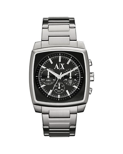 Stainless steel case with a stainless steel bracelet. Fixed stainless steel bezel. Black dial with silver-tone hands and index hour markers. Minute markers. The Armani AX Exchange logo appears below the 12 o'clock position. Dial Type: Analog. Chronograph - three sub-dials displaying: 60 second, 30 minute and 24 hour. Quartz movement. Scratch resistant mineral crystal. Pull / push crown. Solid case back. Case diameter: 40 mm. Square case shape. Band width: 24 mm. Deployment clasp. Water resistant at 50 meters / 165 feet. Functions: chronograph, hour, minute, second. Casual watch style. Armani Exchange Stockton Chronograph Black Dial Brown Leather Mens Watch AX2251