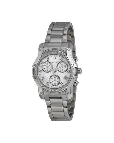 Bulova ladies' stainless steel round dial chronograph. A beautiful watch with masculine design features is softened by sparkling diamonds.