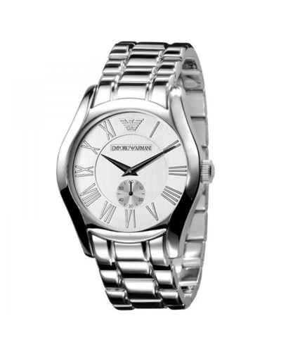 Stainless steel case with a steel link bracelet. Fixed stainless steel bezel. Silver dial with steel hands and Roman numeral hour markers. Armani logo at the 12 o'clock position. Seconds sub-dial at the 6 o'clock position. Quartz movement. Scratch resistant mineral crystal. Stainless steel case back. Case diameter: 42.5 mm. Case thickness: 12 mm. Deployment clasp. Water resistant at 50 meters / 165 feet. Emporio Armani Mens Stainless Steel Bracelet Watch AR0647.