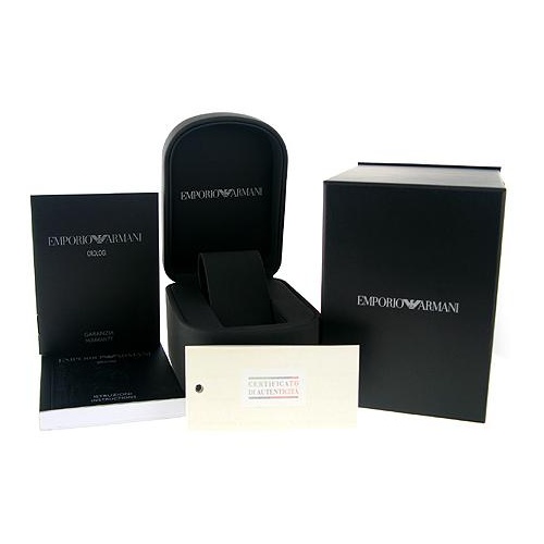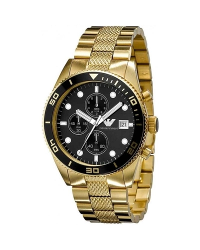 Sport watch, Japanese quartz movement, Chronograph featuring 60-minute, 1/10th second and chronograph seconds subdials, Polished silver-tone hands with luminous accents and sweep seconds, Luminescent polished silver-tone hands mark subdials, Applied luminescent baton/dot markers with silver-tone accents and indices, Silver Arabic numbers and indices mark subdials, Analog date aperture at three o'clock, Unidirectional polished gold-tone stainless steel bezel with black top ring and gold-tone Arabic numbers and indices, Brushed/polished gold-tone stainless steel round case, Textured gold-tone steel crown with black detailing and Armani logo, Polished gold-tone steel selector buttons, Gold-tone stainless steel screw-down caseback, Mineral crystal, 50 meters/165 feet water resistant 2 Year SW Warranty.