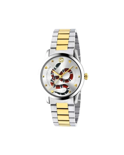 This is an outstanding time-piece from the Gucci G-Timeless collection. Featuring a brushed and polished two-tone (silver, gold) stainless steel bracelet. Silver dial with all attention drawn towards the iconic snake all enclosed within a polished stainless steel case. Incredibly reliable Swiss quartz movement. This superb time-piece is perfect for the fashion-conscious man, just lay back and let the positive comments from envious friends role in.